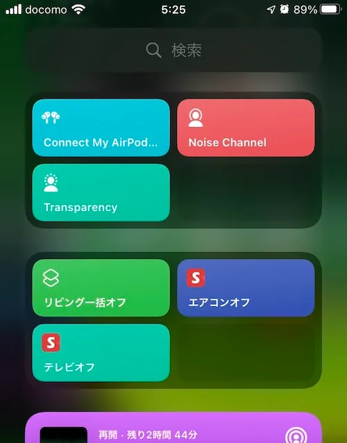 やはりペアリングの切り替えは満足度が高い。前のイヤホンだと一度BlueToothの設定を解除してペアリングし直さないと切り替えられないと落差が激しすぎるのもあるが、それがなくなるだけでとても楽だ。 ちなみにペアリングの自動切り替えは挙動がイマイチ理解できなかったのでMacBookProでは右メニューのオーディオ設定から直接AirPods Proを選択、iPhoneでは下記のようにショートカットを用意して対応している。