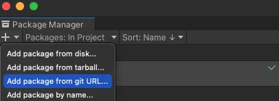 メニューの「Window > Package Manager」でパッケージマネージャのウインドウを開き、下図のようにウインドウ左上の「+」ボタンをクリックして出てくるプルダウンメニューから「Add package from git URL…」を選択します。