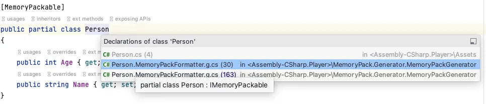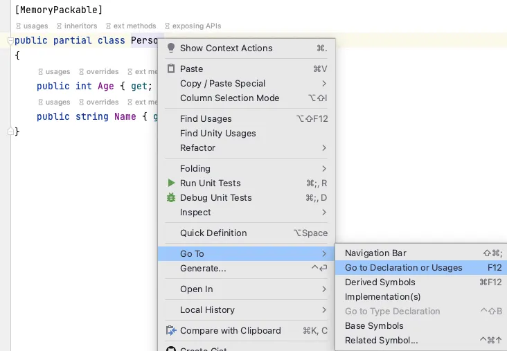 上記の指定によってSource GeneratorがPerson型のシリアライズとデシリアライズのためのコードを自動生成します。コードは {TypeName}.MemoryPackFormatter.g.cs という名前で作成されます。このコードを確認したい場合、Riderであれば下図のように型にカーソルをあてて「Go to > Go to Declaration or Usages」を選択すると、