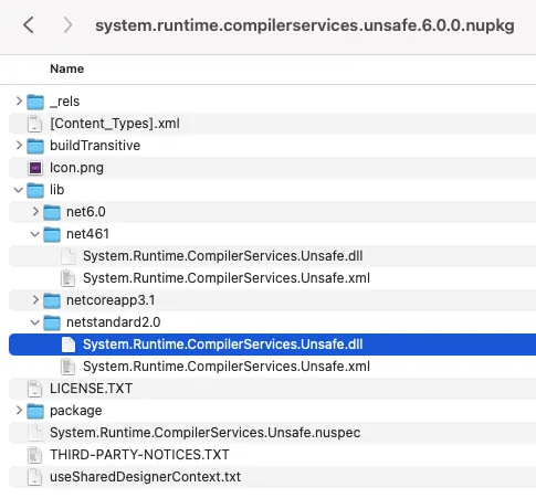 次に、nupkgをzipとして解凍して、その中にあるDLLを引っ張ってきます。macOS標準では、ファイル名の末尾に「.zip」を追記後、そのファイルを開くとzipとして解凍されます。その中のlib/netstandard2.0内にあるSystem.Runtime.CompilerServices.Unsafe.dll(下図)をUnityプロジェクト内に配置します。