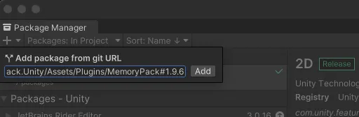 選択後に出てくるテキストボックスに下図のようにhttps://github.com/Cysharp/MemoryPack.git?path=src/MemoryPack.Unity/Assets/Plugins/MemoryPack#1.9.6というURLを入力します。ちなみに末尾の # 以降はバージョンになり、ここにリリース済みのタグを入力すると任意のバージョンをインストールできます。 この記事を書いた 2022/12/17 時点での最新バージョンは1.9.6なので、そのバージョンを入力しました。