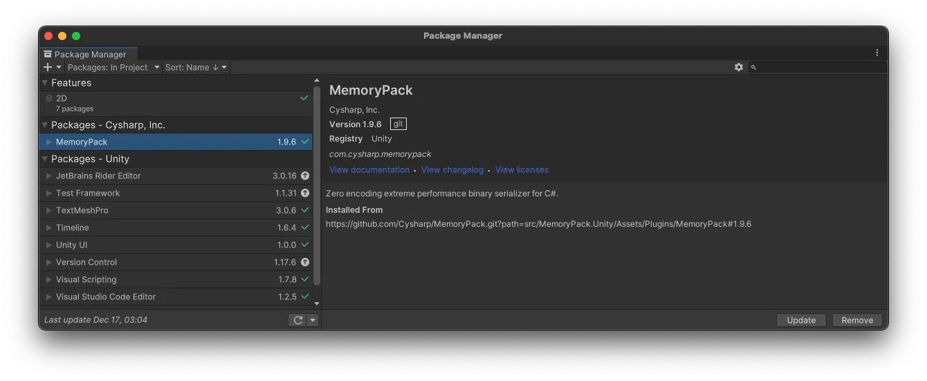 その後、下図のようにMemoryPackが表示されていればパッケージのインストールは完了です。