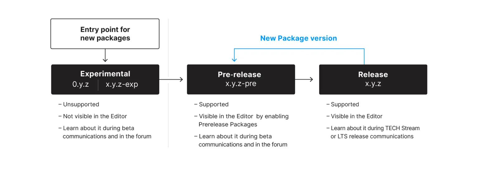 - 2021.1のテックストリームからパッケージマネージャのリリースライフサイクルに変更が入り、ExperimentalとPre-release、Releaseの3フェーズになりました。