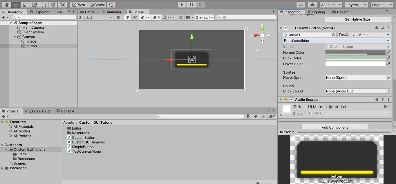 IPointerClickHandlerなどのインターフェイスで独自のGUIイベントをハンドリングする方法と、それらを用いて独自のボタンを実装する方法を解説しています。