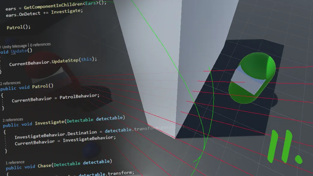 前回の記事ではAIの目や耳のような感性を実装する方法について紹介しましたが、今回はAIの挙動として、指定されたポイント間をパトロールし、プレイヤーを見つけたとき追いかけ、プレイヤーの立てた音が聞こえたら調査を行うAIを実装します。